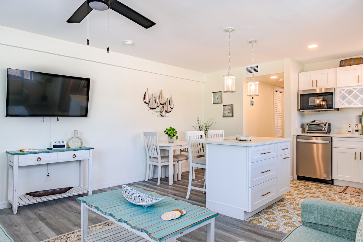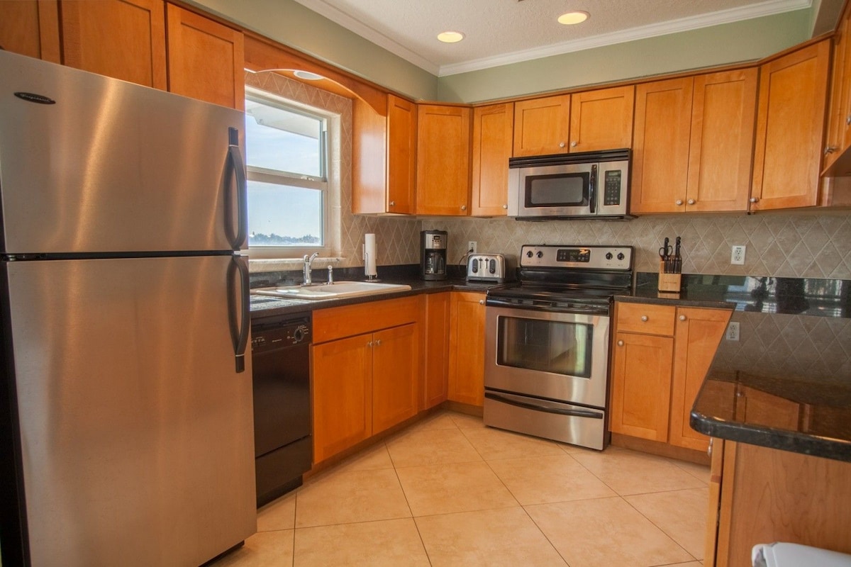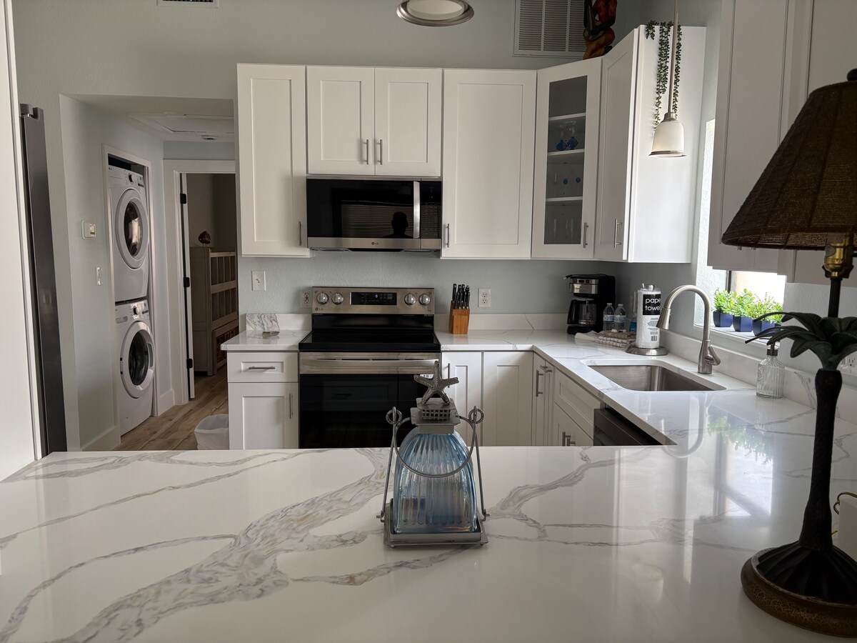 Escápate a un tranquilo refugio frente al mar en la Isla de Capri, en Treasure Island. Disfruta de las apacibles vistas al canal desde tu patio privado, perfecto para el café de la mañana o para relajarte por la noche junto al agua. Este luminoso departamento de 1 dormitorio es ideal para parejas y familias pequeñas, a poca distancia a pie de playas de arena blanca, Johns Pass, restaurantes y vida nocturna. Pesca desde el muelle compartido, explora la isla con bicicletas eléctricas y un scooter de cortesía, o relájate con wifi rápido, estacionamiento gratuito y lavandería en las instalaciones.