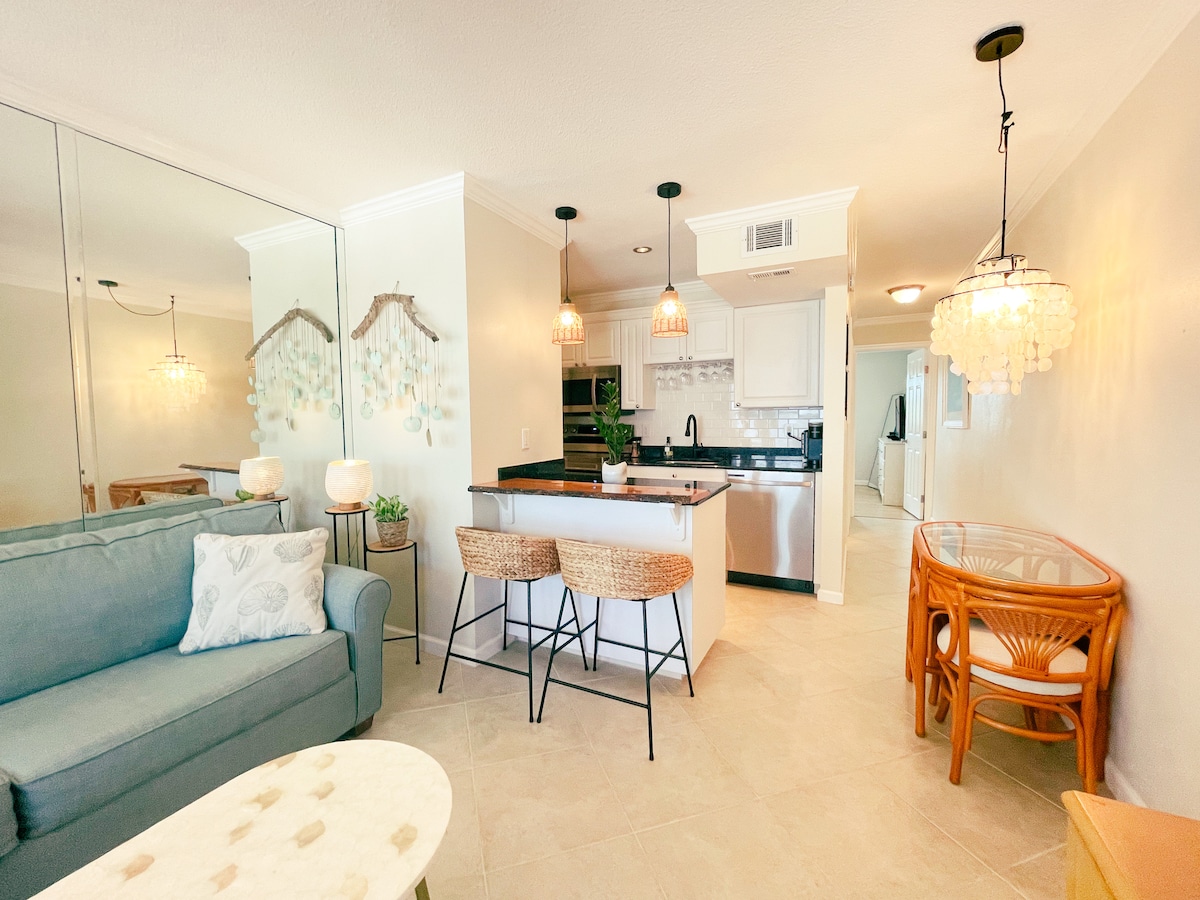 Nuestro apartamento tiene espectaculares vistas al agua desde la bahía hasta la playa. Tenemos una cocina grande y única en nuestro centro vacacional, con encimeras de granito, armarios de madera y todos los electrodomésticos de acero inoxidable. Se proporciona todo lo necesario para preparar una comida junto con especias y condimentos básicos, café, crema y azúcar. El dormitorio principal tiene una nueva cama tamaño king y un vestidor con todo el equipo de playa también disponible para tu uso. También tenemos 2 televisores de pantalla plana de 50 pulgadas con cable.