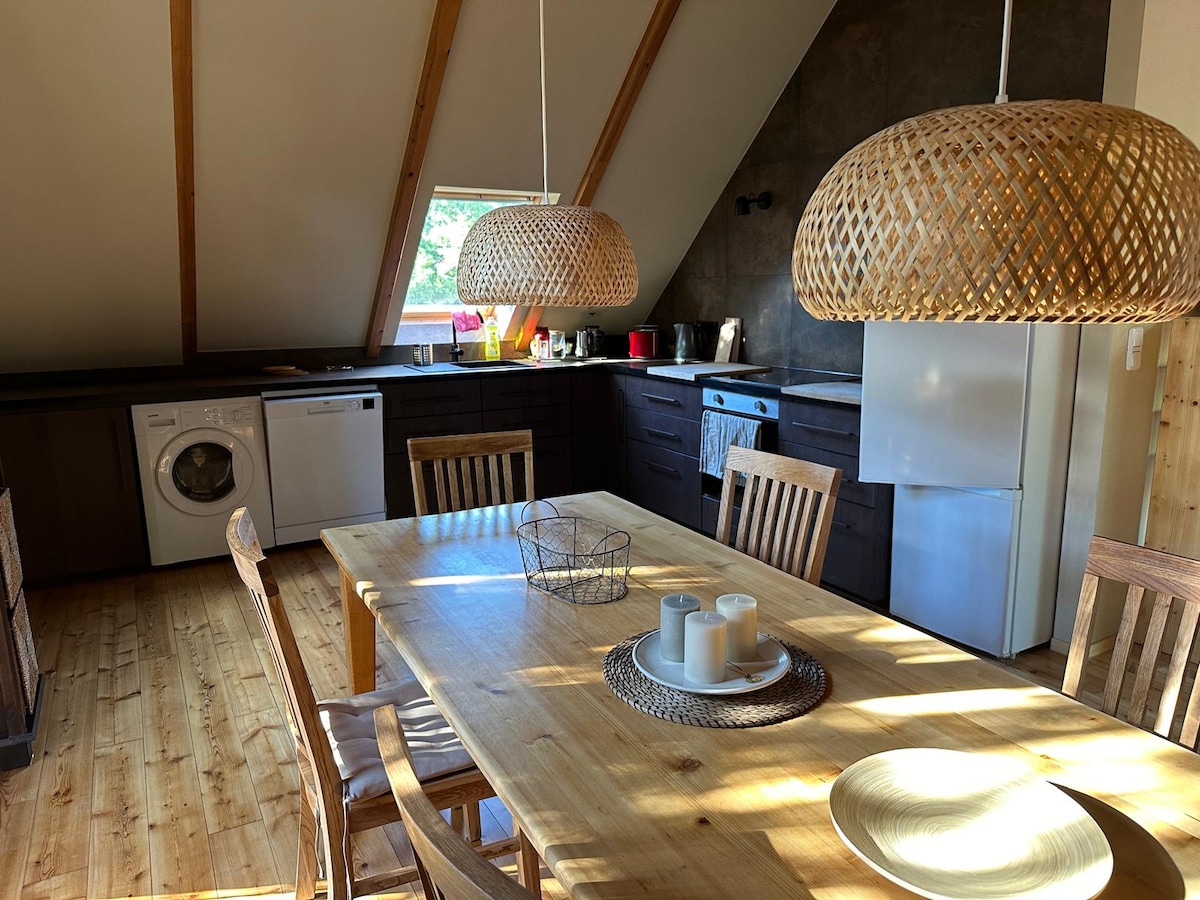 Dachgeschoss Wohnung 20 Autominuten von Potsdam und Berlin und 30 Zugminuten vom BER entfernt. Großzügige, vollausgestattete Designküche*, Badezimmer mit Agape Vieques Badewanne und passendem Waschbecken * , Schlafzimmer mit 2,70m großem Bett * , Fitnessraum kann als zweiter Schlafbereich genutzt werden. Hier ist ein 1,80m Doppelbett*Beamer mit App Vorinstallation für NETFLIX, Disney + und Amazon Prime Login, Spielsachen, Supermarkt mit Bäcker und Fleischer Getränkemarkt*Badeseen&Wandern