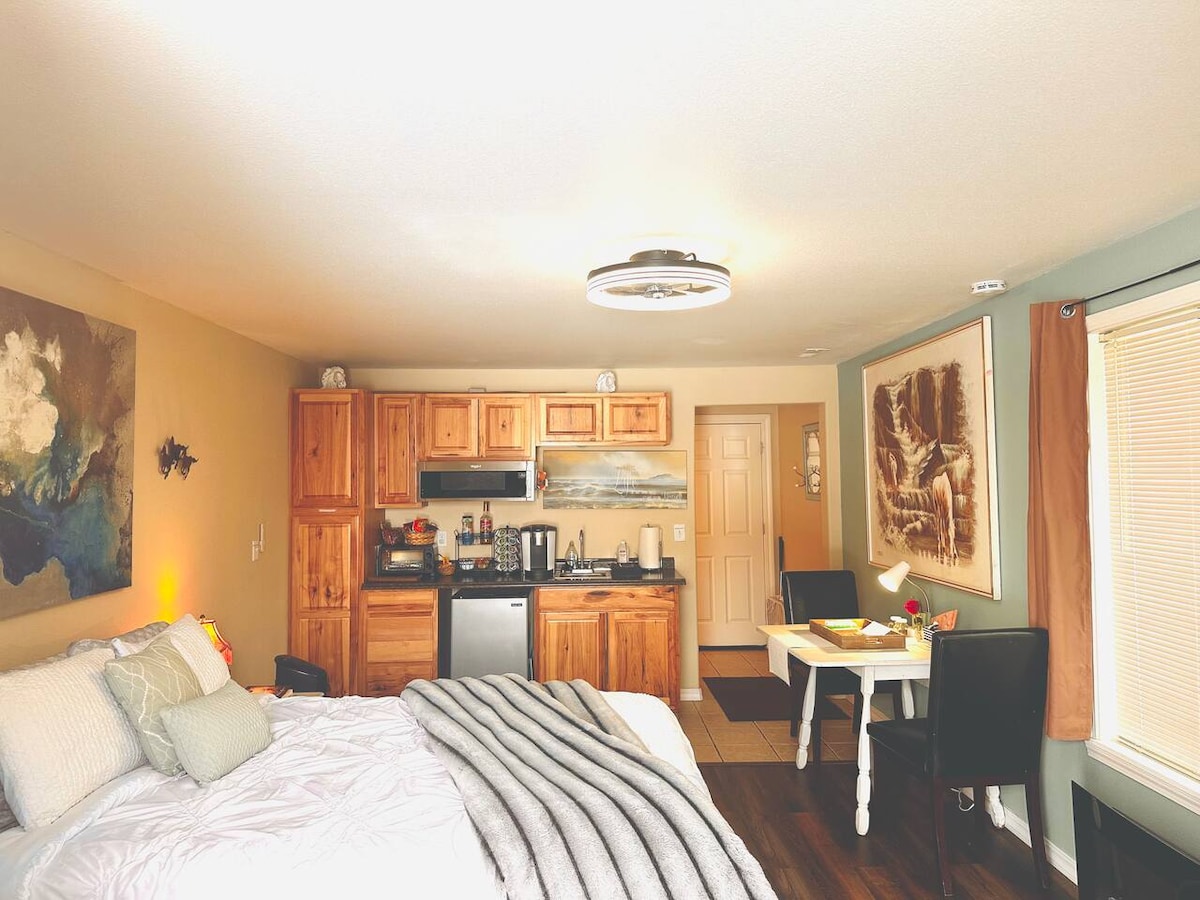 A cozy book-lover's retreat, with exceptional hospitality from an experienced host. Quiet 600ft² garden-level studio with a private entrance. My husband and I live upstairs. Centrally located for business & leisure. Walk to Leslie Groves Park. 5 min to PNNL, WSU, Kadlec, downtown Richland, restaurants. 15 min to PSC Airport, wineries. Enjoy a fireplace, a cloud-soft queen bed, fast Wi-Fi, work desk. Ideal for a couple's getaway, business travelers, and cultural explorers experiencing the region.
