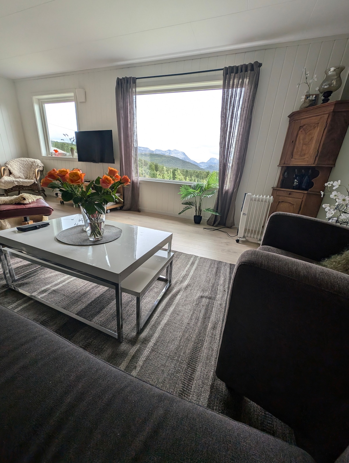 Nueva casa de campo de 2014 a solo 10 km del aeropuerto de Evenes. La cabaña se encuentra a medio camino (260 km en cada sentido) entre Tromsø y Å en el continente de Lofoten. La cabaña tiene un estándar sencillo y bueno con la mayoría de los servicios que uno espera encontrar en un hogar regular. La cabaña tiene preciosas vistas hacia Tjeldsundet en el norte y tiene sol de medianoche desde finales de mayo hasta mediados de julio. En la parte oscura del año hay buenas condiciones para admirar la aurora boreal.