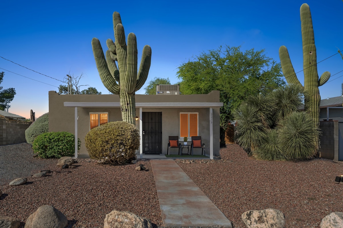 Escápate a la tranquilidad en nuestro auténtico bungalow de adobe, enclavado en el corazón del vecindario central de Tucson 's Palo Verde. Esta joya de la década de 1940 cuenta con 900 pies cuadrados de comodidad acogedora, diseñada para envolverte en un ambiente y calidez positivos desde el momento en que entras. Convenientemente situado entre Banner University Hospital y Tucson Medical Center, y a poca distancia en coche de la Universidad de Arizona, nuestro retiro en el desierto promete una estancia tranquila con fácil acceso a las ubicaciones clave de Tucson.