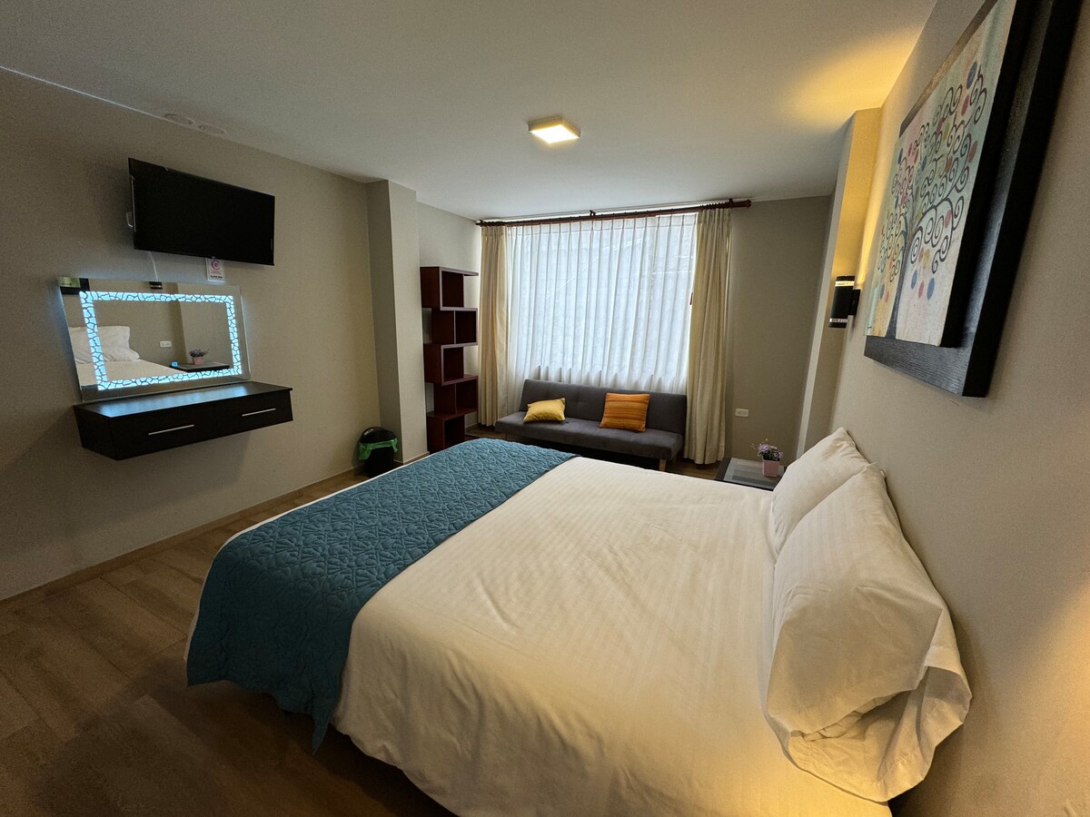 Vive una escapada especial en nuestra suite acogedora en pleno corazón de la ciudad, ideal para parejas que desean compartir momentos únicos con todo a pocos pasos. Su ubicación privilegiada te permite caminar hacia restaurantes, cafeterías y atractivos turísticos sin necesidad de auto. El espacio es sencillo, cómodo y muy limpio, pensado para que descanses, te relajes y disfrutes de una estadía práctica, cálida y con atención cercana que te hará sentir bienvenido desde el primer momento.