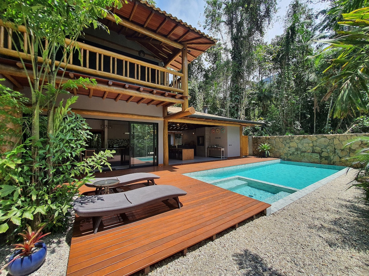 Com arquitetura típica do sudeste asiático, a casa é toda palafitada e distribui-se por dois bangalôs interligados por deck. Um verdadeiro recanto, a apenas 90m da praia de Itamambuca. Possui piscina com hidromassagem, rodeada por espreguiçadeiras com confortáveis almofadas e paisagismo tropical, que à noite ganha destaque devido à iluminação. Agradável espaço gourmet com churrasqueira. 4 suítes com ar condicionado.