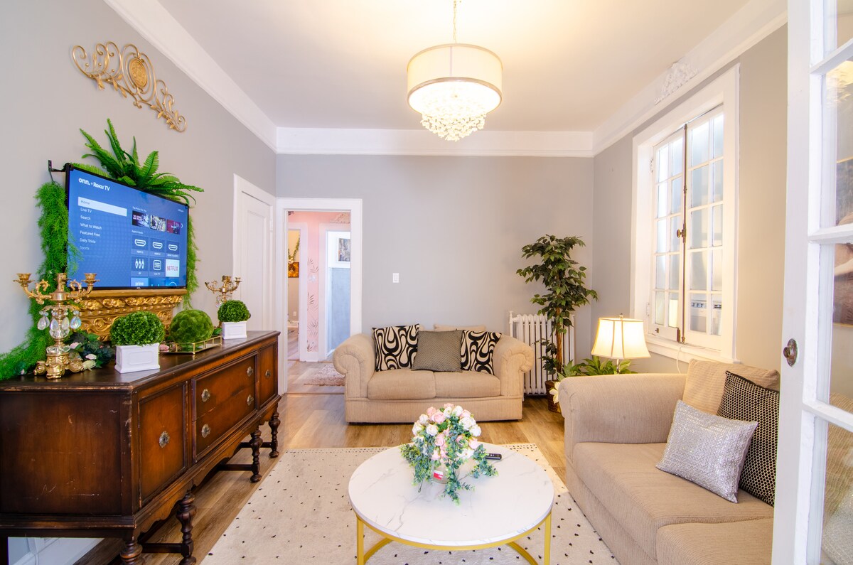 Una joya de 1 dormitorio inspirada en las princesas cerca de Nueva York: ¡una escapada de cuento de hadas en Nueva York! A solo 20 minutos de Manhattan, este acogedor refugio cuenta con aire acondicionado, patio privado, baño abastecido, cocina completa, TV inteligente y lavandería en la unidad. Descansa como la realeza en la cama tamaño queen con un lujoso colchón Nectar. La sala de estar cuenta con un sofá cama extraíble de tamaño completo (estándar americano) para espacio adicional para dormir, además de un colchón de aire inflable automáticamente tamaño queen para mayor comodidad. Explora los restaurantes frente al mar de Jersey City y Newport