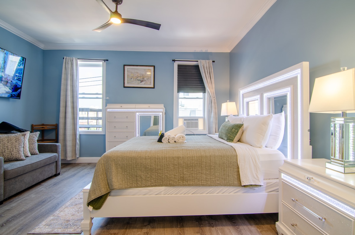Bienvenido a nuestra lujosa suite King, perfecta para parejas o familias pequeñas. Disfruta de una cocina totalmente equipada, WiFi gratuito, alojamiento apto para mascotas, TV de 55 pulgadas, Internet de alta velocidad y escritorio. La sala de estar tiene un acogedor sofá cama con ruedas que puede alojar a dos personas. El dormitorio cuenta con una cama tamaño king. Todo con una elegante decoración moderna. A solo unos pasos de la parada de autobús de Nueva York con un rápido viaje de 15 minutos. Situado en un barrio vibrante cerca de atracciones, restaurantes y tiendas. ¡Reserva ahora para disfrutar de una estadía cómoda!