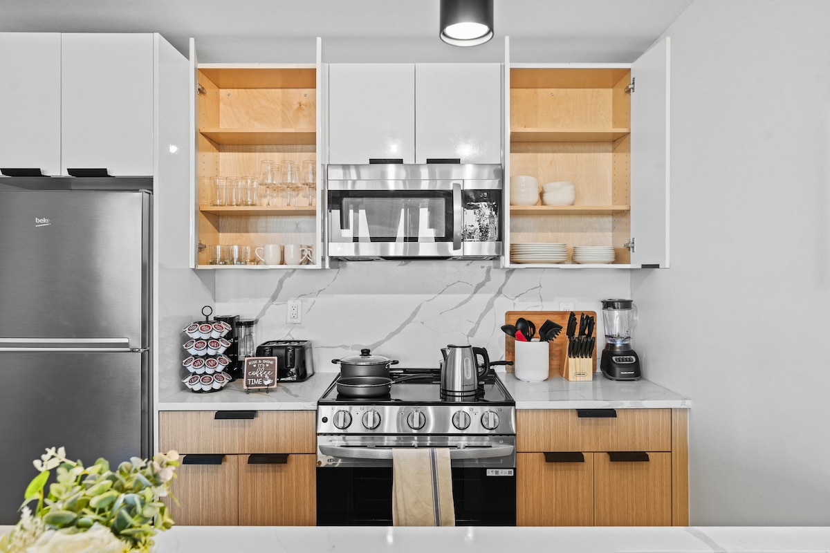 Entra en un departamento de lujo de 2 dormitorios y 1 baño en Newark donde el estilo moderno se encuentra con la comodidad. Capacidad para 10 personas con 5 camas (incl. colchón de aire). Televisores inteligentes en todas las habitaciones, wifi rápido, cocina inoxidable, entrada con teclado, balcón y acceso a un gimnasio, salón y estacionamiento. Ubicación privilegiada - Aeropuerto Newark Liberty: 5 minutos en auto. - MetLife Stadium y American Dream Mall: 20 minutos en auto. - NYC Times Square: 40 minutos en auto. - Prudential Center: 10 min en auto. - Ferry de la Estatua de la Libertad: 20 minutos en auto. - NJPAC: 12 minutos en coche.