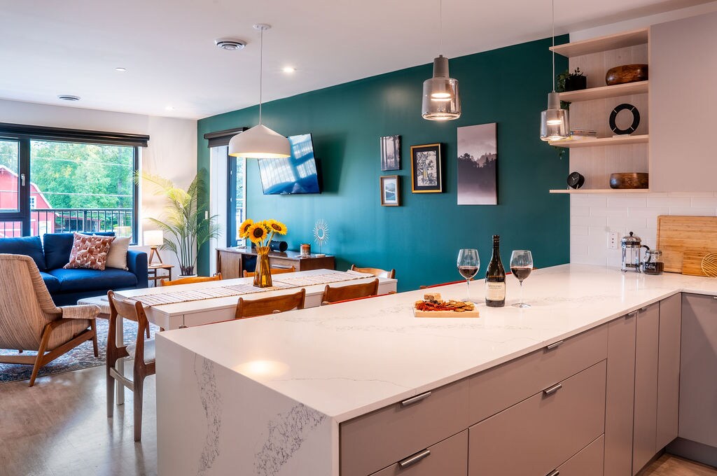 Bienvenido a Summit Solitude, un alquiler vacacional tranquilo y espacioso que hace honor a su nombre. Ubicado en el tercer piso rodeado de copas de árboles y cimas de montañas, este apartamento contemporáneo de 2 dormitorios y 2 baños ofrece un lugar para que te retires, te relajes, te rejuvenezcas y te reconectes. El diseño interior sofisticado y minimalista te ayudará a desconectar del ajetreo de tu rutina diaria. Las 2 camas individuales se pueden convertir en una cama tamaño king y el sofá cama de la sala de estar es adecuado para una persona pequeña.