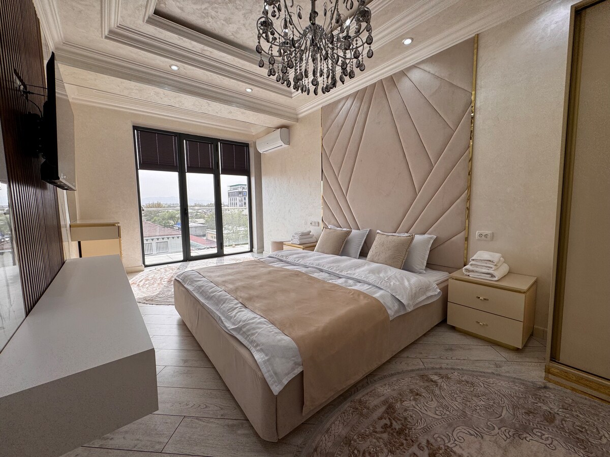 Un lugar maravilloso para hospedarte. Apartamento totalmente amueblado, lugar tranquilo, plantas verdes con vistas maravillosas. El condominio bien ubicado fue renovado en febrero de 2024 ( 115 m2) Hay 3 habitaciones grandes: 1 dormitorio, 1 gabinete (oficina) 1 sala grande con sofá (cama plegable) y balcón con vistas maravillosas La conveniente ubicación del alojamiento te permite llegar fácilmente a los lugares más populares de Samarcanda. Esto hará que tu estancia sea aún más agradable: simplemente puedes caminar por la calle Univer. Boulev.