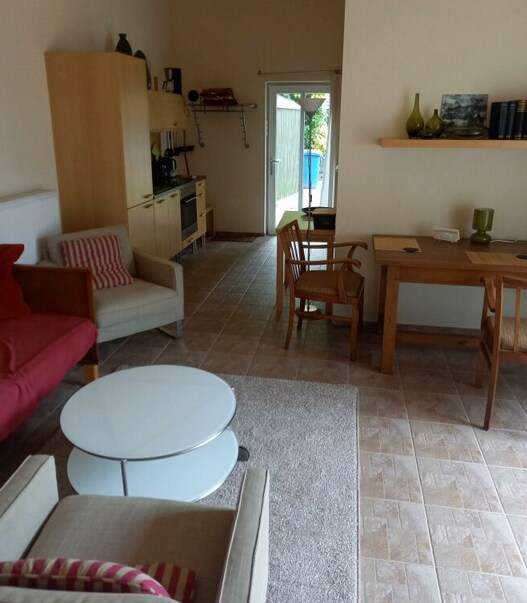 En nuestro jardín rústico, natural e idílico, hay 2 pequeños apartamentos bungalows "Sanddorn" y "girasol", donde puedes tomarte un descanso del ajetreo y el bullicio de la vida cotidiana en un pequeño pueblo pesquero en el agua. Los pequeños apartamentos pueden alojar a 2 personas y se encuentran en nuestro patio invisible. También se puede reservar una sauna finlandesa de estufa de leña (25 €).