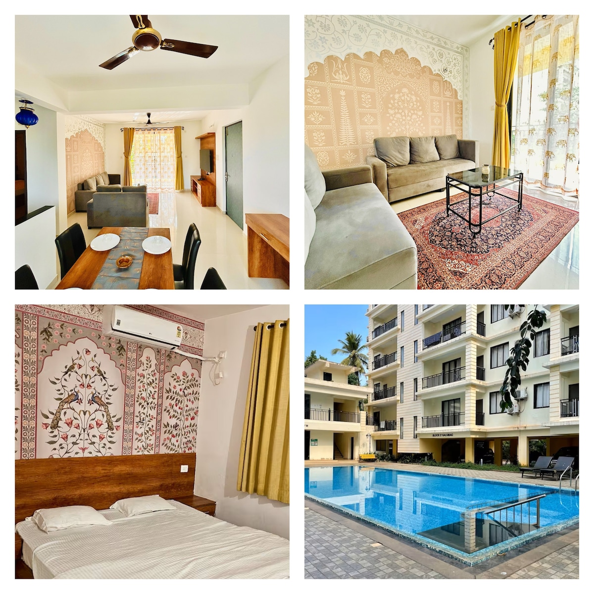 Bhoomi : Cozy 1BHK Home in Patnem, Goa with Stunning Views and Shared Pool With its stunning views of the lush landscapes and the shared pool, this apartment offers the perfect blend of tranquility and convenience. Amenities: - 1 Bedroom with double bed - Fully equipped kitchen - Living area with comfortable seating - 2 Balconies with stunning views - Shared pool - Boho-inspired decor - Complimentary Wi-Fi - Open Parking available