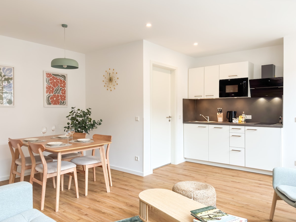 Apartamento estudio de 31 m² con terraza. ♥ Cama queen size y sofá cama de alta calidad para 2 personas más. ♥ Terraza con zona de estar y barbacoa propia. ♥ Cocina moderna y totalmente equipada con microondas y cafetera. ♥ Acogedor comedor con capacidad para 4 personas ♥ Smart TV con Disney+ y conexión wifi rápida ♥ Elegante cuarto de baño con ducha XXL ♥ Cuna y trona disponibles ♥ Lavadora y secadora en el edificio de uso gratuito ♥ Aparcamiento gratuito delante de la puerta