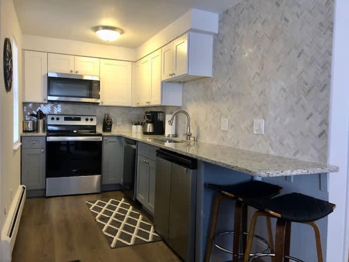Los huéspedes tienen acceso completo a un hermoso apartamento tipo estudio en planta baja con loft (capacidad para 5 personas) en Four O 'clock Rd. 200 yrds del Snowflake Lift, con un garaje climatizado y taquilla de esquí. Los huéspedes también pueden descansar y relajarse cómodamente en el condominio con una cama murphy tamaño queen y un futón doble en la planta principal con una cocina de tamaño completo, así como una amplia cama tamaño queen se encuentra en la zona del loft del condominio, al que se puede acceder a través de una encantadora escalera de madera incorporada.