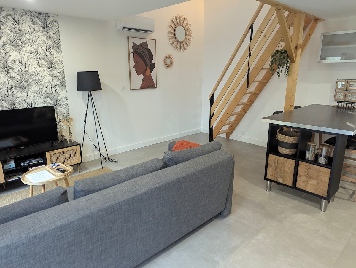 Bienvenido a nuestra casa siéntase como en casa ,a 45 minutos de puy du fou,a 25 minutos de Nantes,a 55 minutos del mar (la Baule,Pornic)podrá descubrir el viñedo del muscadet,Clisson conocida por su arquitectura italiana a 15 minutos,en la planta baja una hermosa sala de estar cocina equipada ,lingerie, aseo,arriba 2 hermosas habitaciones ,TV ,baños,gran jardín en temporada Piscina (de 10h a 19h)terraza BBQ y plancha disponible. estamos en un pequeño pueblo tranquilo y agradable