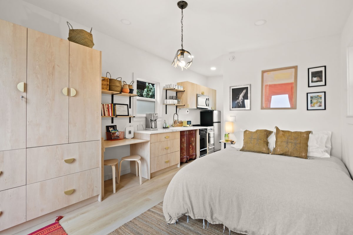 Cerca de los distritos del aeropuerto, Alberta, Hollywood, Concordia y Mississippi, este estudio loft es perfecto para vivir en casas pequeñas en la ciudad. La cama tamaño queen de Tuft & Needle en el loft es accesible a través de una escalera hecha a medida. La planta principal tiene una cocina totalmente funcional con una estufa vintage caprichosa y toques recuperados. El espacioso baño incluye una combinación de bañera y ducha con azulejos rectangulares. La sala de estar incluye espacio para un sofá cama tamaño queen y una pequeña mesa de comedor. ¡Prueba la vida en una casa pequeña aquí!