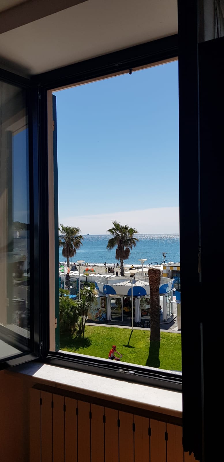 Luminoso apartamento de tres habitaciones frente al mar con vistas espectaculares, a pocos pasos de la playa, de los locales y de todos los servicios de Albissola. Sala de estar con cocina americana, amplia y acogedora habitación doble y una bonita habitación con dos camas individuales. Amplio baño con bañera y ducha.