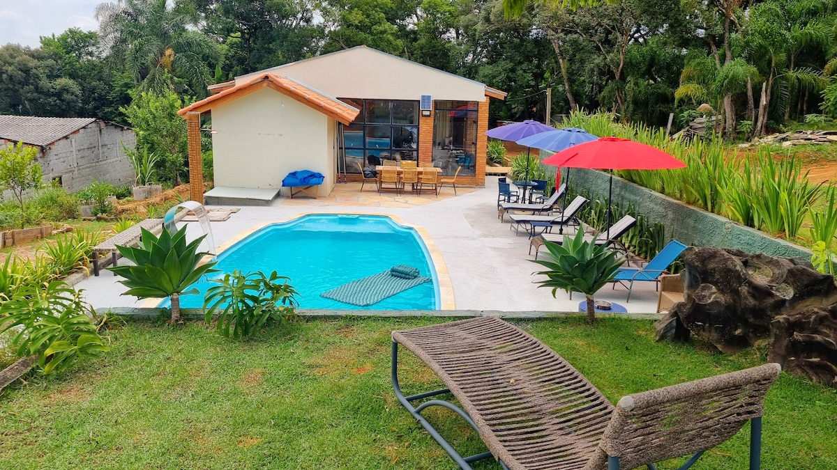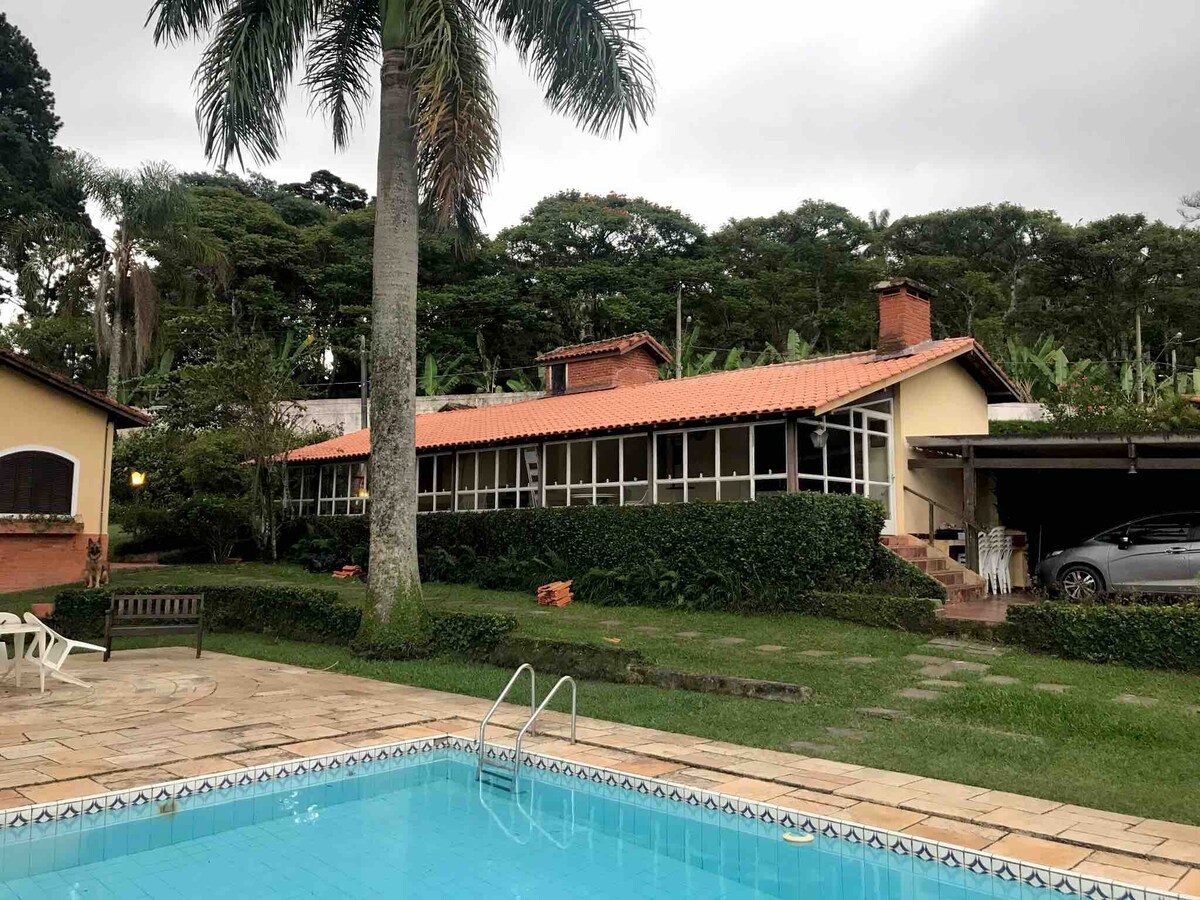 Amplia casa de campo cerca de la Serra de São Roque, rodeada de bosque nativo, en un pequeño condominio. ¡Tendrás contacto con animales salvajes y pájaros como visitantes! ¡Clima templado de montaña! Todas las habitaciones tienen terraza y ventiladores de techo. Zona de ocio con hidromasaje climatizado, mini pista, piscina, barbacoa, horno de leña y espacio para los niños (casa en el árbol y cama elástica)!