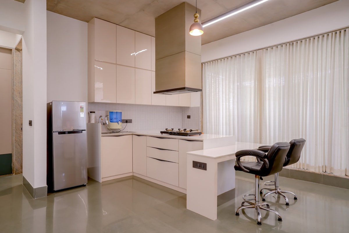 ¡Alójese en el departamento de 3 habitaciones cuidadosamente diseñado por el propio arquitecto y ubicado en el corazón de Ahmedabad! Una casa refrescante con abundante luz natural y ventilación. Como el interior está despejado y decorado con una relajante paleta de colores neutros con sutiles detalles, se convierte en la opción perfecta para todos los viajeros. Diseñado para huéspedes que valoran/aprecian la comodidad y la limpieza. Ideal para familias (bebés/niños), viajeros de negocios, grupos, huéspedes corporativos, etc., para estadías cortas o largas.