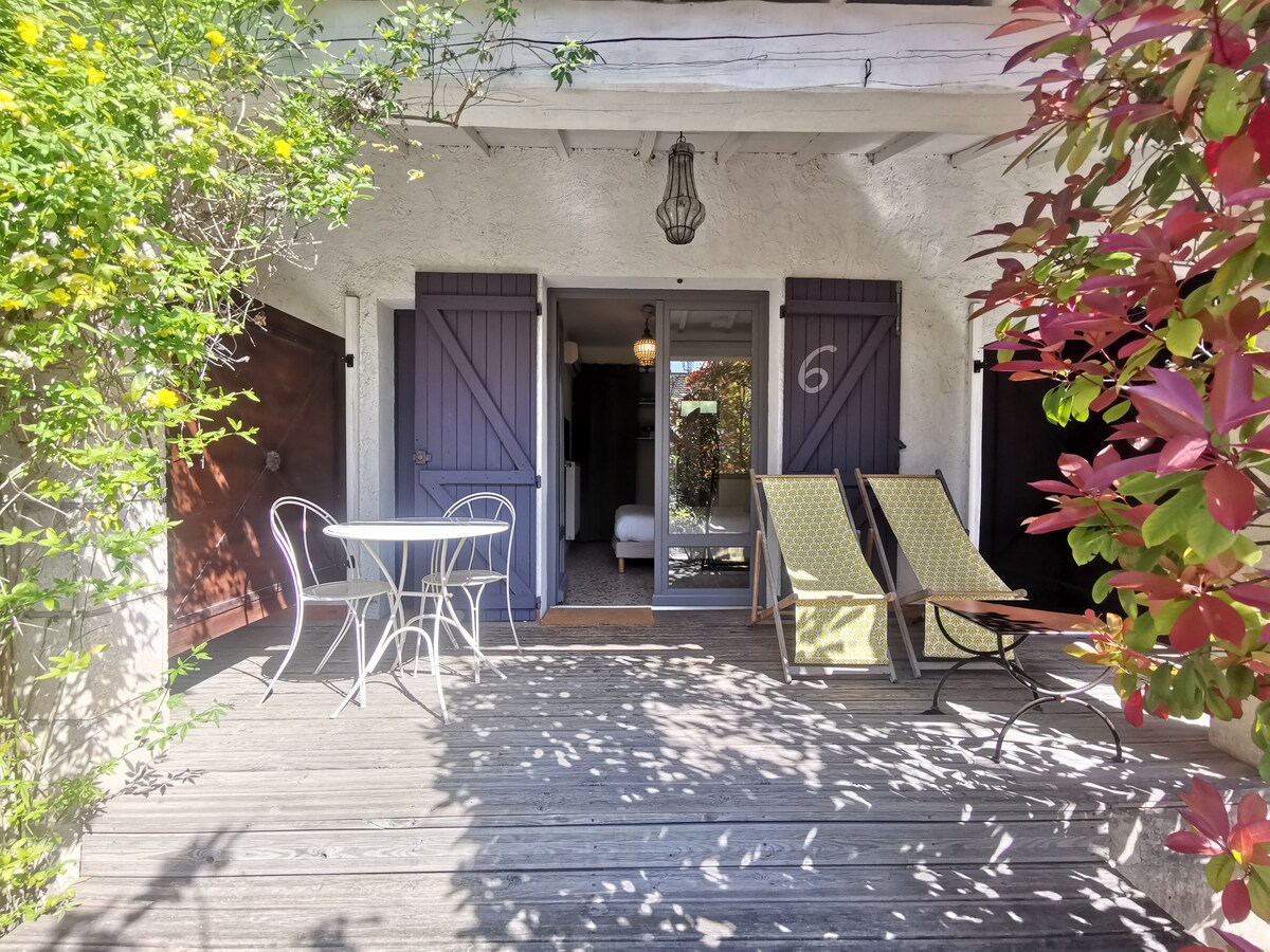 Notre boutique hôtel de charme est situé à 250m du centre ville. Cette grande chambre indépendante et privée de 23m² avec son espace extérieur privatif est située dans le jardin, au calme. Elle dispose d'une douche à l'italienne et d'un lit king size qualité 4*. Bien sûr le parking et le wifi est inclus. La chambre est climatisée et dispose d'une TV écran plat. Les petits déjeuners buffet peuvent vous être proposé en supplément sur demande. Accès à la piscine en saison. Bar.