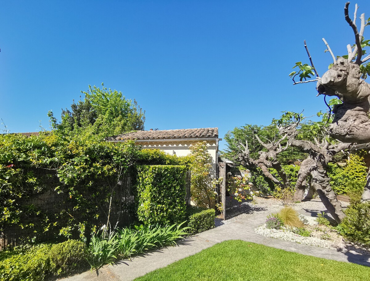 Notre boutique hôtel de charme est situé à 250m du centre ville. Cette grande chambre privée de 19m² avec sa terrasse privative donnent sur le jardin arboré de figuiers, au calme. Elle dispose d'une douche et d'un lit queen size qualité 4* neuf. Bien sûr le parking et le wifi est inclus. La chambre est climatisée et dispose d'une TV écran plat. Les petits déjeuners buffet peuvent vous être proposé en supplément sur demande. Accès à la piscine en saison. Bar.