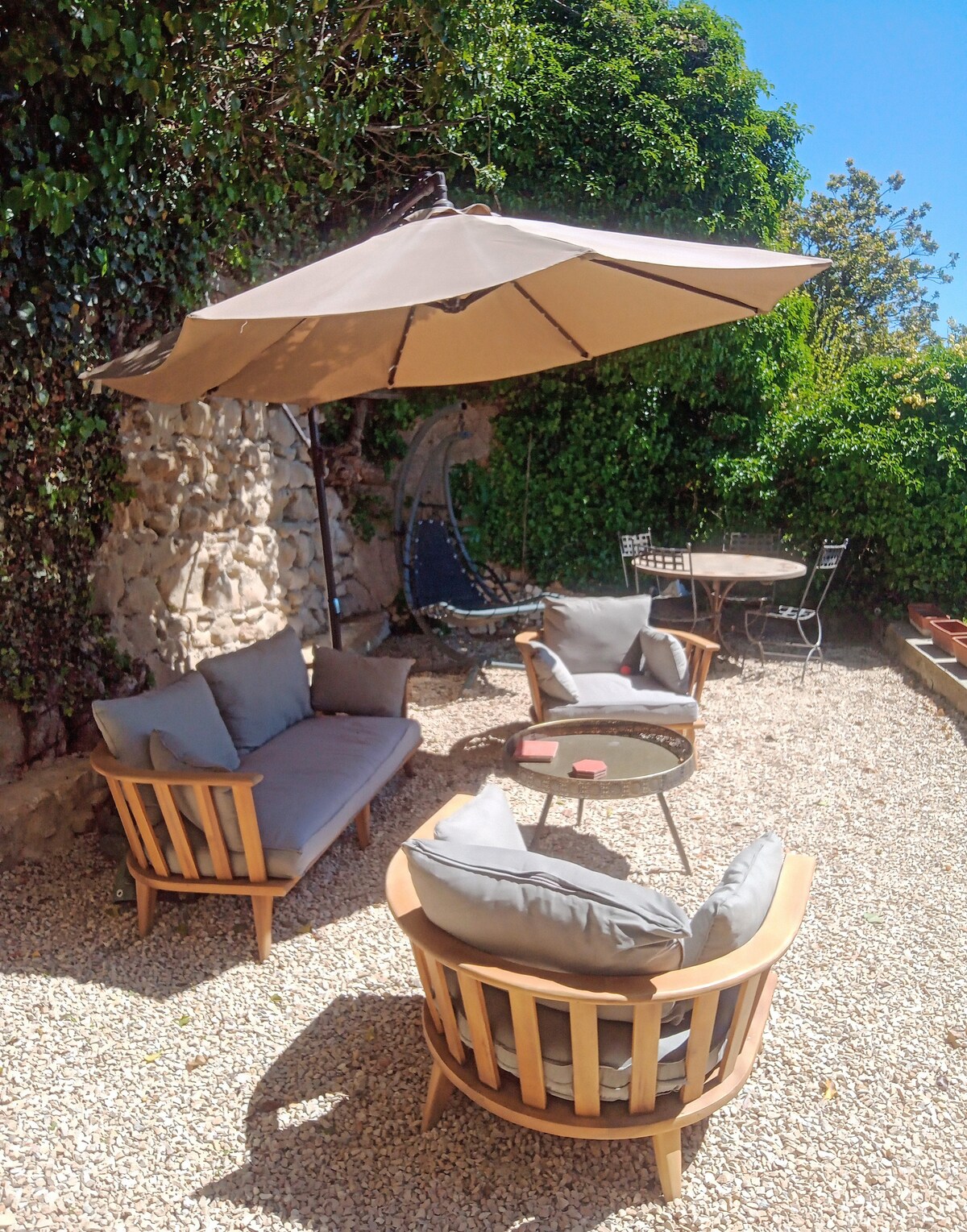 Encantador y amplio estudio situado en el centro, en una casa reformada de tres siglos de antigüedad. Con una ubicación ideal a 40 metros de la calle principal con restaurantes y tiendas; sin embargo, el estudio se encuentra en una zona tranquila a lo largo de un pequeño arroyo, con vistas a los jardines. Este pintoresco estudio tiene acceso a un jardín de inspiración provenzal y japonesa con un gran césped, fuentes de agua (estanques de nenúfares y peces), cocina al aire libre (fregadero, plancha, barbacoa, vajilla) y un cenador con 4 sofás biplaza. Acceso wifi desde el jardín.