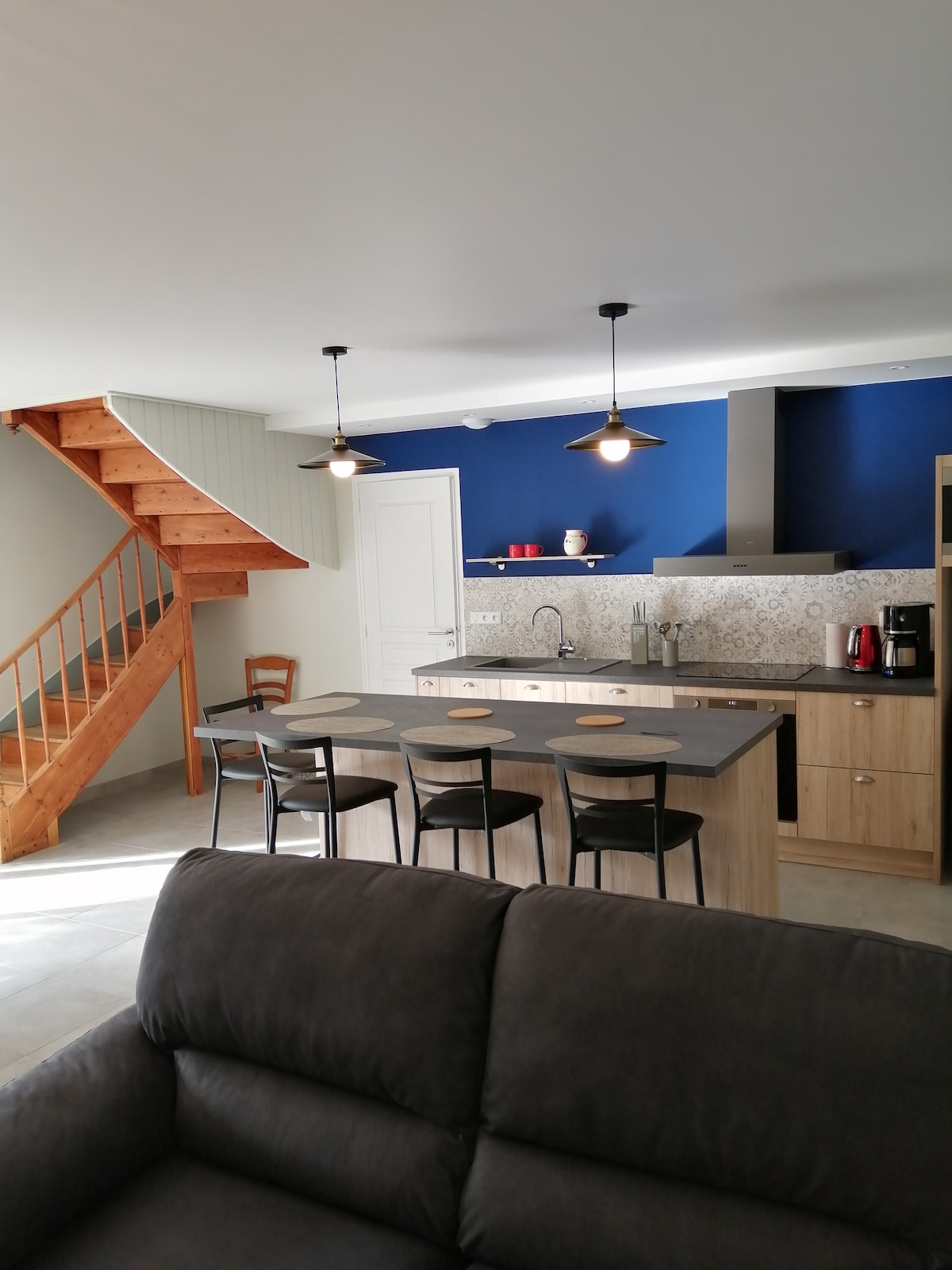 Granero de piedra recientemente reformado lleno de luz y color en un bonito pueblo a sólo 1 km del mar. Los suelos de madera y el aislamiento natural dan una sensación de calidez. La sala de estar de arriba conduce a una soleada terraza en la azotea o sale de la cocina a un jardín privado a la sombra. Comidas caseras de productos nacionales o locales disponibles bajo petición, así como visitas a nuestra minigranja y jardín. La cocina bien equipada incluye lavavajillas, placa de inducción, microondas y cafetera.
