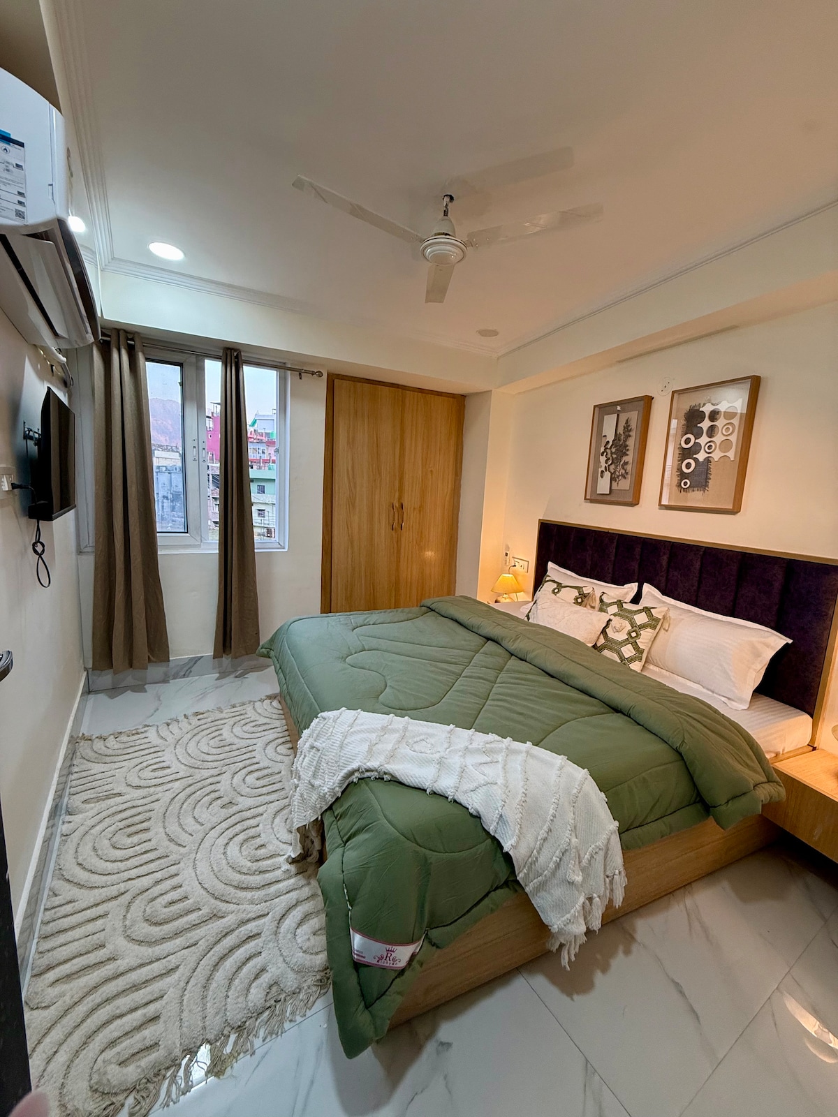 A 1 BHK luxe homestay in Tapovan, located on the 5th floor with soothing mountain views and beautiful morning sunlight. Fully furnished-thoughtfully designed, the home features a cozy bedroom, a comfortable living area, and a functional kitchen perfect for couples, solo travelers, or small families. The property offers easy access, convenient car parking and Wi-Fi. Ideally situated between Secret Waterfall Rd and Balaknath Rd, close to Sai Ghat, it keeps you near popular cafes and yoga schools.