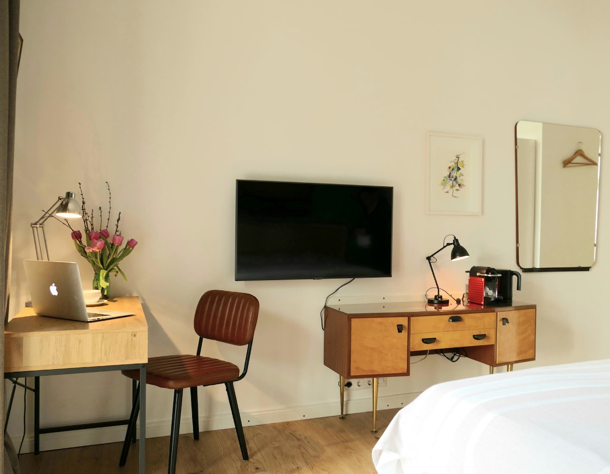La habitación, reformada y decorada con mucho cariño en marzo de 2021, te espera en la parte trasera de un hermoso edificio antiguo de 1904. La habitación, luminosa y muy tranquila, tiene su propio baño moderno con ducha y un gran balcón que da al jardín trasero con sol por la tarde.