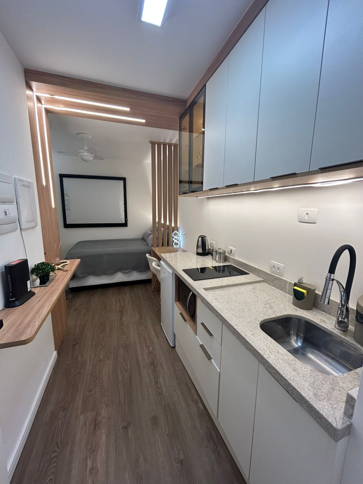 Estudio moderno, nuevo, acogedor, ubicación perfecta, con una hermosa vista desde el balcón, especialmente por la noche. Wifi rápido, escritorio, TV inteligente de 55”, cama Queen. Aire acondicionado (frío/calor). Lavadora y secadora y una hermosa isla en la cocina. 50m2 de mucho estilo-27ºandar, Silencioso. En el Centro/Batel, cerca de comercios, bancos, centros comerciales, polo gastronómico y Hospital. En el edificio: piscina, gimnasio, sala de juegos, sauna, jacuzzi, conserjería las 24 horas.