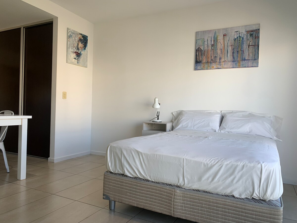 Hospédate en este alojamiento único y tranquilo. Luminoso, ubicado frente a un gran parque. Todas las comodidades, heladera, microondas, cocina completa. Barrio de casas bajas muy tranquilo, cerca de varios comercios que están abiertos todo el día y algunos las 24 horas. con varias líneas de colectivos para moverse por la ciudad. además el parque da posibilidad de hacer caminatas muy gratificantes. Restaurantes y cafeterías a pocos metros.