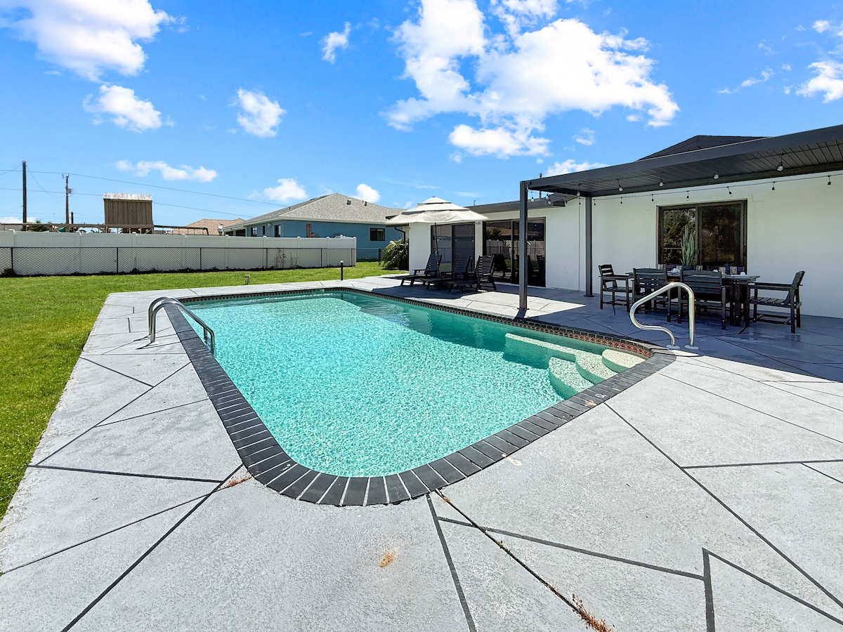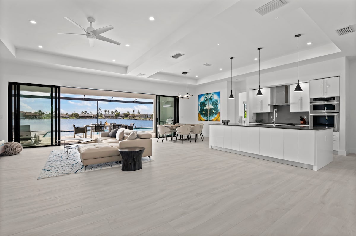 Escápate a Cape y disfruta de una estancia tranquila y relajante en esta nueva casa espaciosa y moderna de 4 dormitorios (2 suites king), 3 baños con una piscina climatizada de gran tamaño en un canal de agua dulce. Esta casa cuenta con un dormitorio dividido y una cocina bien equipada, una gran isla frente a una sala de estar espaciosa que se abre a la enorme piscina/zona de lanai para una verdadera vida interior y exterior. Alójate en una sección deseable de Cape Coral, conveniente para dos aeropuertos, puertos deportivos, playas, restaurantes, tiendas y tiendas de comestibles gourmet.