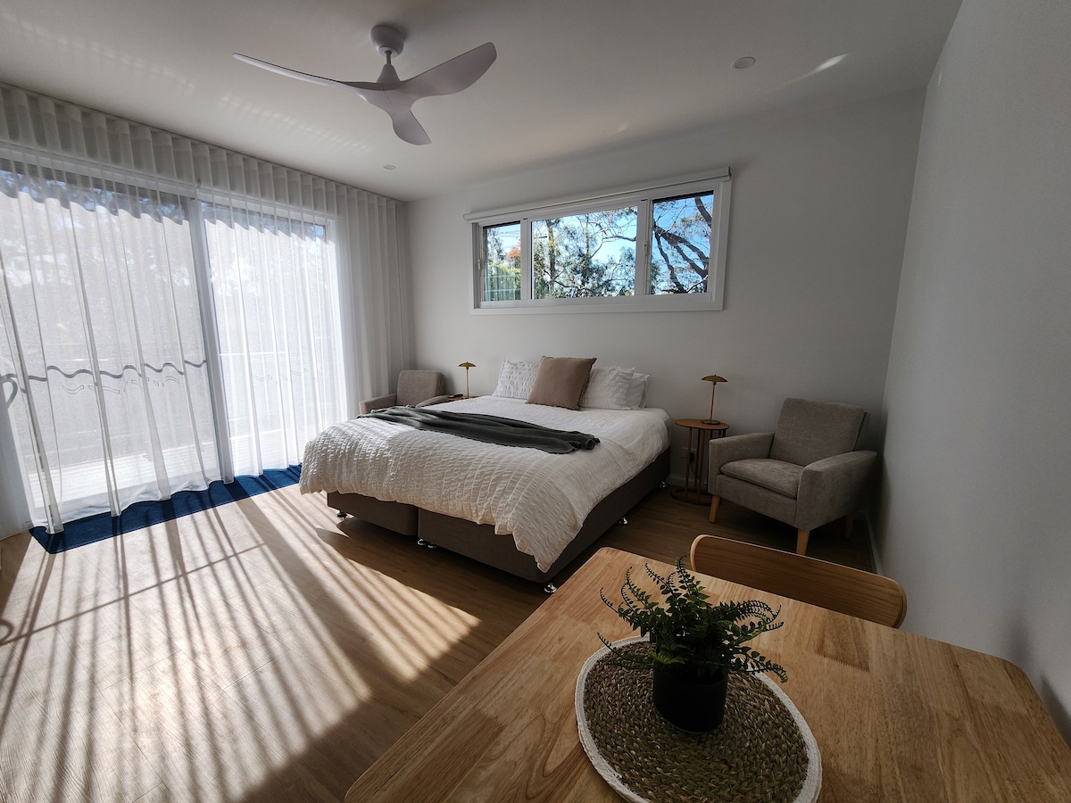 ¡El refugio perfecto para parejas! Departamento tipo estudio de 1 dormitorio con un tema playero. El estudio está en nuestro patio trasero, con su propia entrada separada. Compartimos el patio trasero, pero tenemos cuidado de asegurarnos de que tengas privacidad. Estamos en Minerva Avenue, consulta la ubicación en el mapa. Estamos a poca distancia en auto de todas las playas del área de Huskisson y Vincentia. Estamos "en lo alto de la colina" Las playas más cercanas son Nelson, Blenheim y Greenfields Beaches, a 2 minutos en auto.