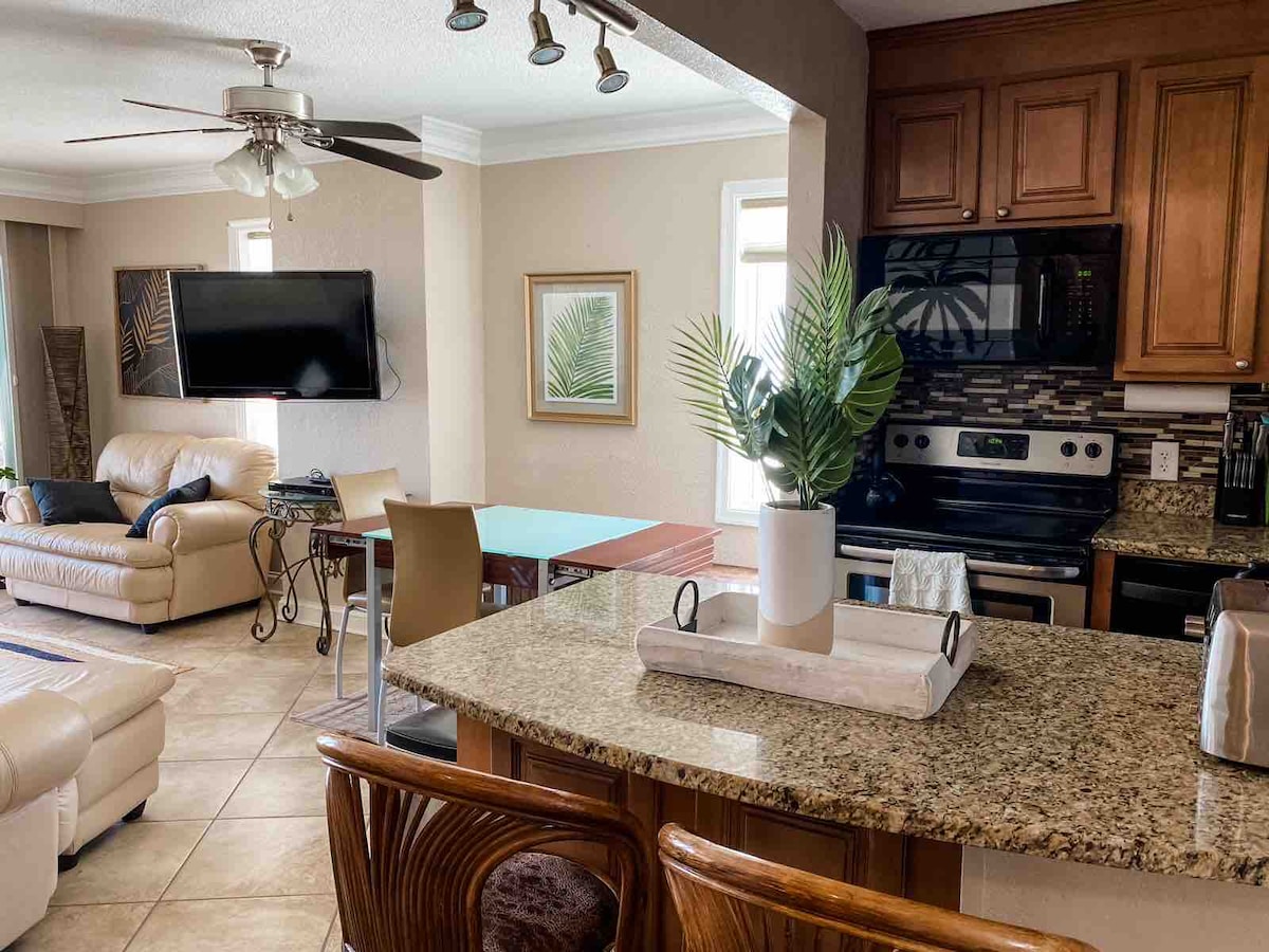 ¡Relájate y crea recuerdos en “Ocean & Palm”, un condominio de 3 camas y 2 baños en LA ESQUINA con VISTAS AL MAR! Disfruta de una piscina cubierta, un gimnasio y (1) un espacio de estacionamiento designado. 2 camas tamaño king, 1 completa y 1 individual, y el sofá de la sala se saca para una quinta cama. Cafetera y café de cortesía o prueba las cafeterías locales cercanas. Prueba mariscos frescos a poca distancia, alquila charters de pesca, parasail, moto acuática o prueba los museos.