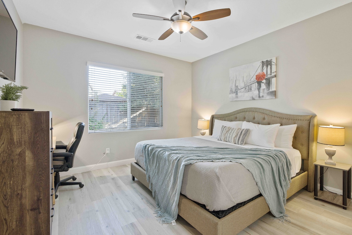 Alójate en nuestra moderna suite en Visalia, a solo 40 minutos de la entrada del Parque Nacional Sequoia y a pocas cuadras del centro. Tiene capacidad para 3 personas, ideal para familias pequeñas, parejas o viajeros solos. Cuenta con una cama tamaño king, una cama individual plegable opcional (a pedido) ideal para niños o adultos más pequeños, una acogedora sala de estar, una cocina pequeña, un espacio de trabajo dedicado con Wi-Fi de alta velocidad y una ducha a ras de suelo. En un vecindario seguro cerca de un parque pintoresco con senderos, base perfecta para aventuras en Sequoia.