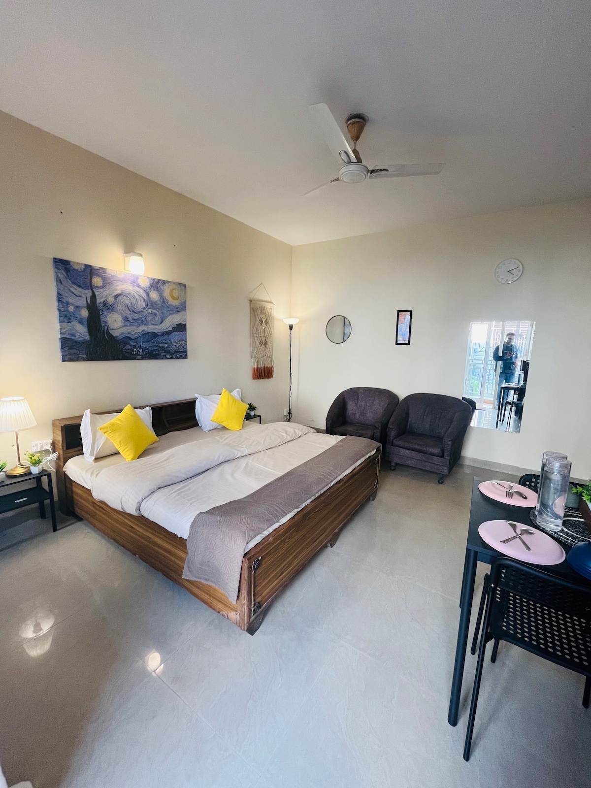 Apartamento tipo estudio bien equipado en Vrindavan ofrece lujo y comodidad en una elegante sociedad cerrada. 🛏️ Estancia cómoda y relajante • Amplio apartamento tipo estudio con balcón privado y relajante vista al jardín. • Cocina totalmente equipada para cocinar. • Baño adjunto moderno con servicios básicos. 📍Ubicación privilegiada • A 1,5 km de Prem Mandir. • A 2,5 km del templo ISKCON. • A 4 km del templo Banke Bihari. • Todos los templos principales en un radio de 5 km. Disfruta de la proximidad espiritual sin el ruido y las multitudes.