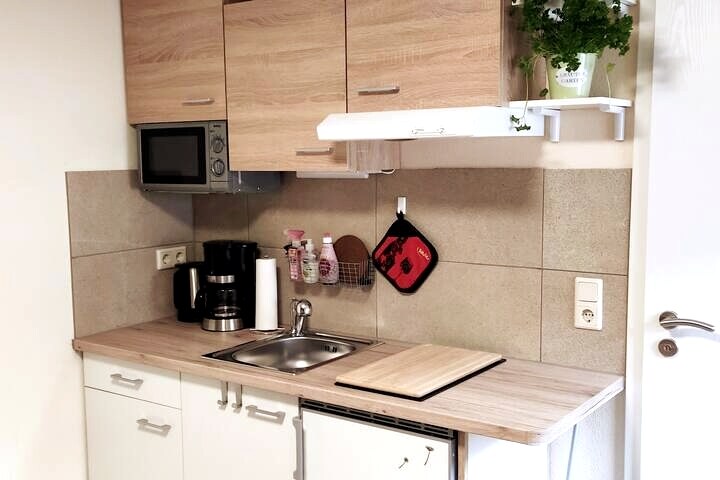 Departamento muy bonito con jacuzzi+ sauna al aire libre (uso no incluido en el precio, lee el anuncio por completo), gran terraza y silla de masaje. Dormitorio muy bonito. Cocina, sala de estar y comedor disponibles en una habitación. El desayuno se puede reservar además. (por solo 12,50 euros por persona) La cocina está totalmente equipada. Baño de burbujas y masajeador de pies disponibles para caminar. ¡No se admiten mascotas! Es un departamento para no fumadores. Les pedimos a los huéspedes que solo fumen al aire libre.