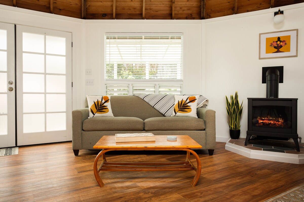 Ubicado en Volcano, HI- 5 millas cortas al Parque Nacional de los Volcanes de Hawái. Dulce cabaña estudio con ducha de bambú exterior: ¡toma una ducha caliente bajo la lluvia! (Ten en cuenta que no hay ducha interior). Cama tamaño queen junto con TV de 32 pulgadas, mininevera, microondas, cafetera de goteo y tetera. ¡Este lugar es pequeño, pero muy lindo! Techos altos con lengüeta y ranura de cedro. Armario pequeño con un espacio para colgar tus abrigos. Inodoro interior y lavabo en el baño.