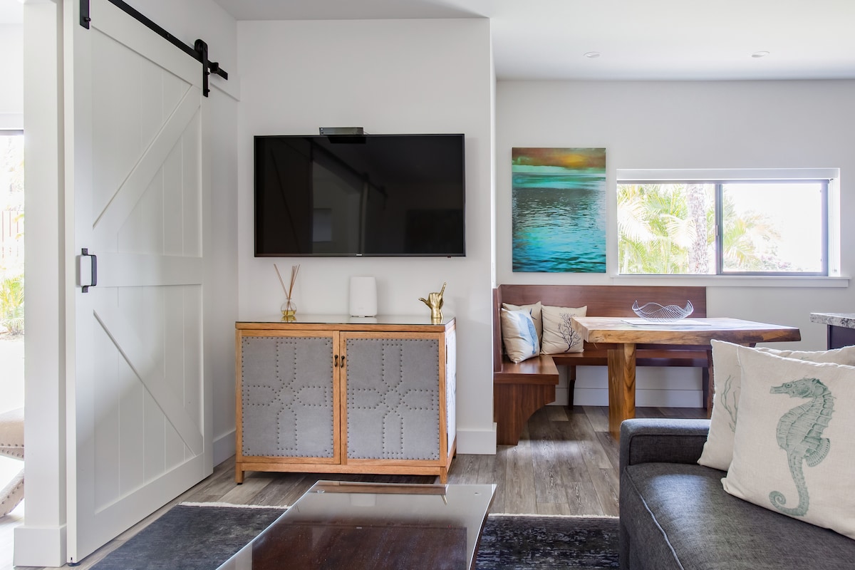 Prep meals in a chic kitchen with granite surfaces and white-washed hardwood floors. Dine at a live-edge table in a cozy corner nook amid nautical décor and modern touches. Unwind in a lounge chair on a sun-drenched patio before taking a swim.