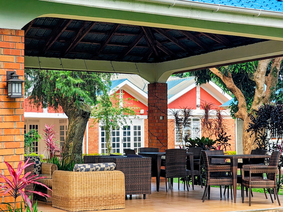 The gated villa is nestled in a peaceful tropical paradise in Kawuku - Bunga, between the center of Kampala and Munyonyo resort. The villa is ideal for family reunions, professional retreats, or groups traveling together. It offers full privacy and modern comfort for each bedroom, beautiful common areas, and a large gazebo. Guests enjoy nearby resorts, restaurants, bars, grocery stores, and markets. Paved roads from the airport and city center to the villa ensuring smooth, dust-free arrival.