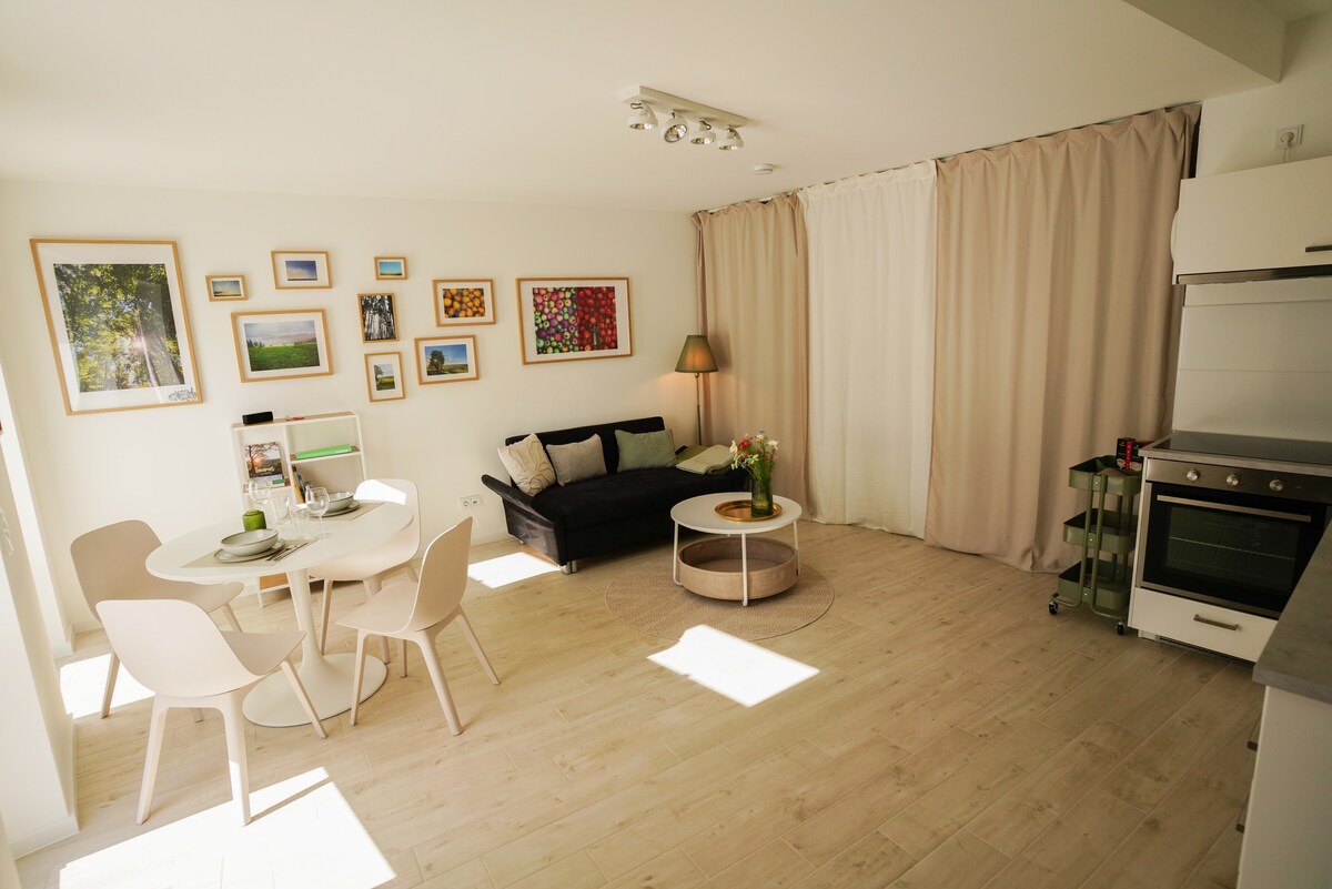 Apartamento panorámico de 60 m², para un máximo de 4 huéspedes • Cama tamaño king, sofá cama, cama plegable (a pedido), cuna para bebés. • Cocina totalmente equipada: estufa, horno, tetera, cafetera, lavavajillas, nevera, TV. • Sábanas, toallas, café y té de alta calidad. • Amplia terraza con tumbona, vista a la naturaleza. Ubicación fantástica: • A 5 minutos en auto/a 30 minutos a pie del centro de Idstein. • Las rutas de senderismo comienzan en la puerta. • A 20 minutos del aeropuerto de Frankfurt y Wiesbaden. • A 2 km de la autopista. • Parque infantil cercano y restaurante de parrilla superior.