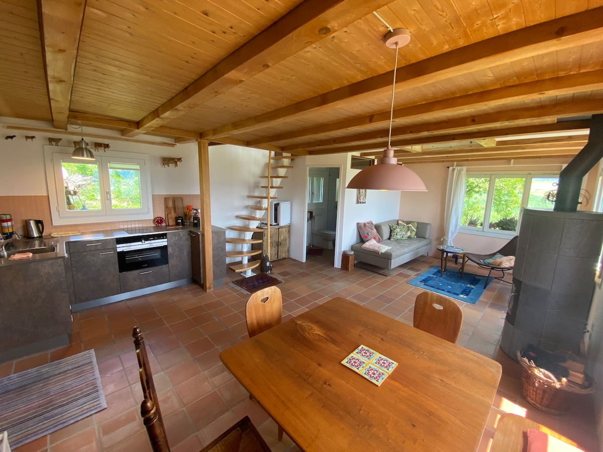 Por la noche, observa la puesta de sol desde la primera fila, duerme muy cerca de las estrellas y despierta por la mañana junto al canto de los pájaros. Todo esto es posible, con nosotros en la acogedora sala de prados en el borde del bosque. El remolque de construcción cuidadosamente renovado con hermosa rebanada panorámica se encuentra en nuestro huerto directamente en el borde del bosque con vistas panorámicas sobre la cadena Stockhorn y el valle de Aaretal. Lejos del ajetreo de la ciudad, este es el lugar perfecto para darle un descanso a tu alma.