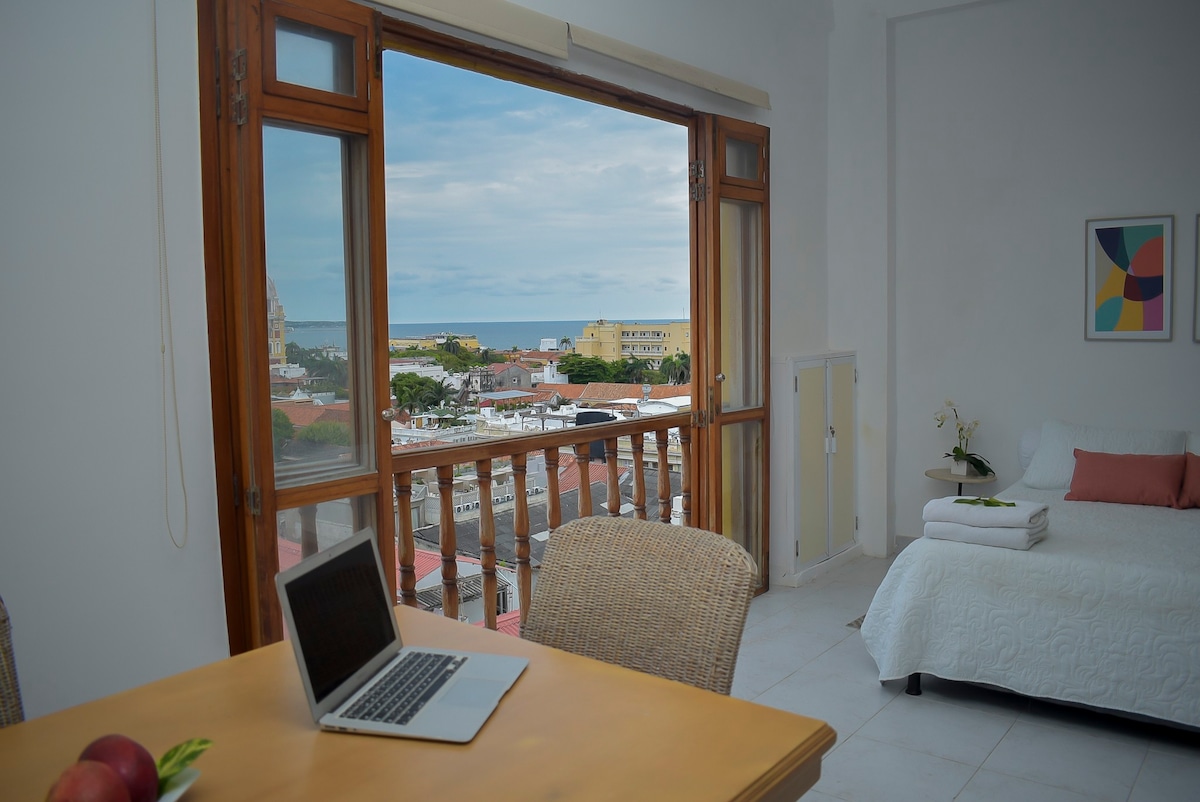 Espectacular estudio/loft en la mitad de la Ciudad Amurallada pero extremadamente tranquilo porque está en el sexto piso. Lleno de luz con bella vista del Mar Caribe desde todos sus rincones. Completamente equipado para hasta cuatro personas.