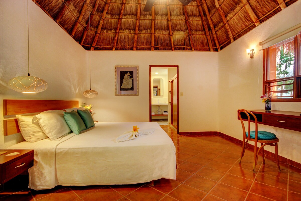 Romántico bungalow con techo de palapa para 2 personas. Espacioso, fresco y bien equipado. Disfruta de su encantador balcón con hamaca rodeado de un jardín tropical para una experiencia única. Cuenta con 1 cama king size, baño privado con amenidades, limpieza diaria, wifi, piscina compartida con jacuzzi, caja fuerte, minibar, TV/cable, estacionamiento gratuito y seguridad las 24 horas. Hay además una terraza común con una bonita vista parcial al mar. Recepción bilingüe.