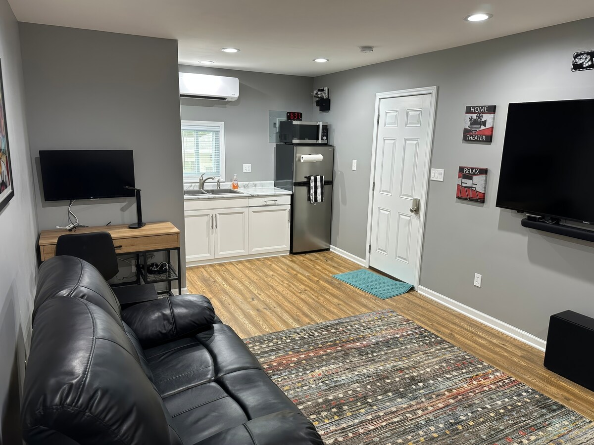 Acogedor apartamento estudio, elegante y funcional. Tranquilo barrio residencial. Cerca del centro de Washington MO y a solo unas cuadras del Mercy Hospital. Contiene TV grande con barra de sonido/subwoofer, cama Queen Murphy desplegable, escritorio para trabajar, cocina pequeña, escritorio con monitor grande, armarios, ducha e inodoro. Estacionamiento techado, acceso al garaje para guardar bicicletas o automóviles pequeños (comunícate con los propietarios si deseas acceder al garaje).