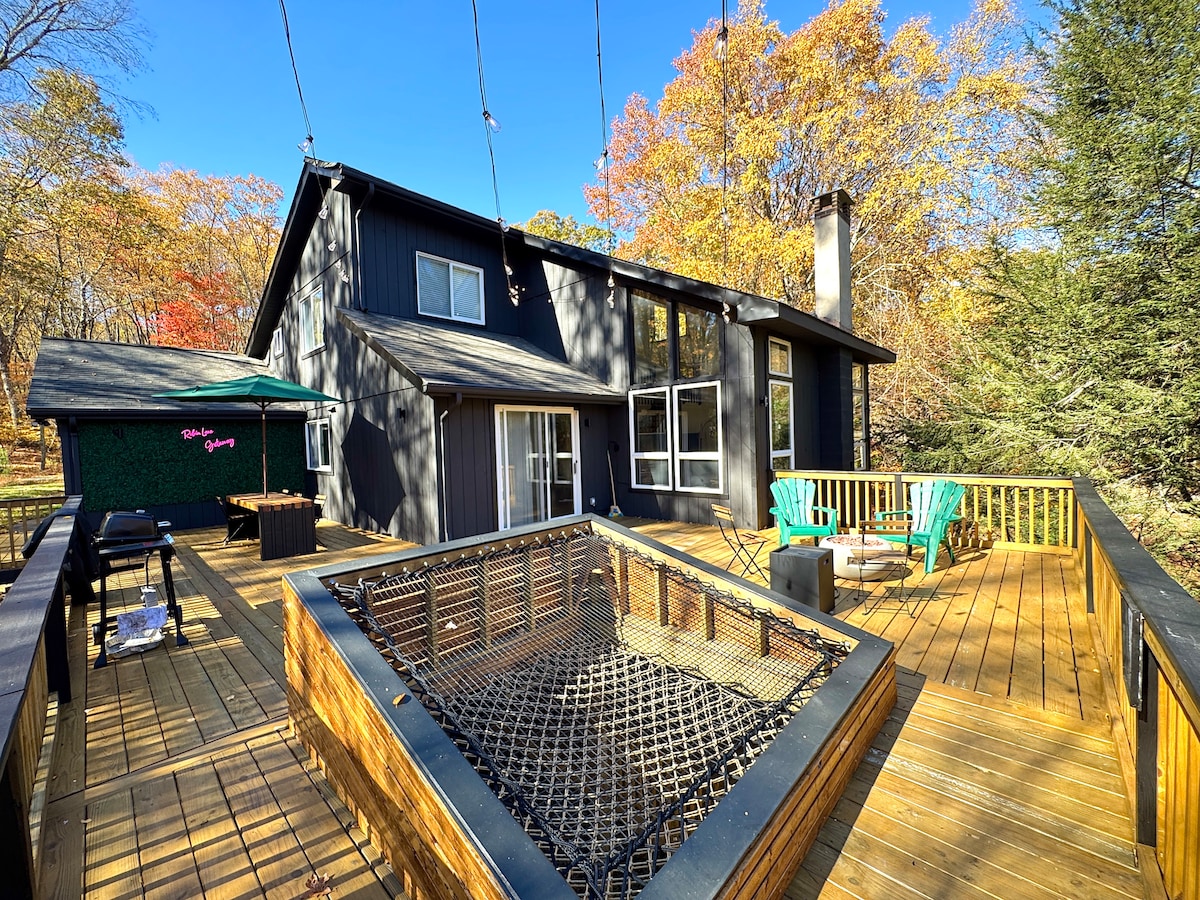 El moderno refugio Pocono tiene capacidad para 10 personas con habitaciones espaciosas, Wi-Fi rápido, juegos de mesa para la diversión en los días lluviosos. Y un estudio de arte próximamente (febrero de 2026). Espacio: 4 dormitorios, cocina completa, espacio de trabajo dedicado, bañera de inmersión y espacio tranquilo en el patio trasero para juegos de patio. ¡Bonificación de 3 estaciones! Acogedor en nuestro porche cerrado con una cuna glamping diseñada para 2 amantes del aire libre. - Estacionamiento gratuito para cuatro autos - Televisión inteligente y streaming. - Cuna y equipo para familias - Superanfitrión de 5 estrellas, respuestas rápidas. ¡Reserva ahora!