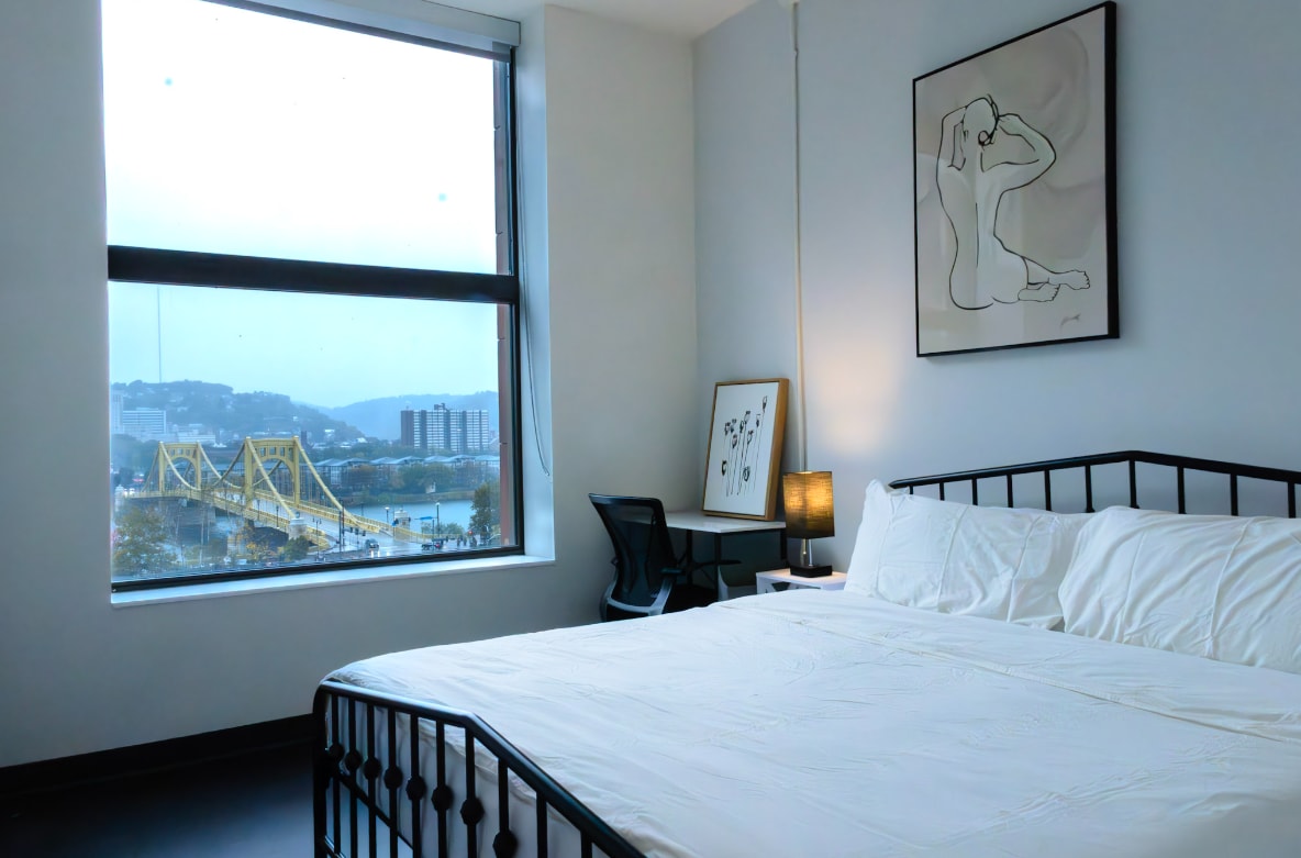 Discover Pittsburgh's vibrancy from this charming apartment at the city's heart. Your window opens to breathtaking views of the point park & the three rivers' confluence as well as the city's two iconic stadiums. In a prime downtown spot, step out to explore local art scenes, culinary delights, and urban life buzz. The apartment features a comfy bedroom with a King Size bed, a relaxing living room, and a fully-equipped kitchen.