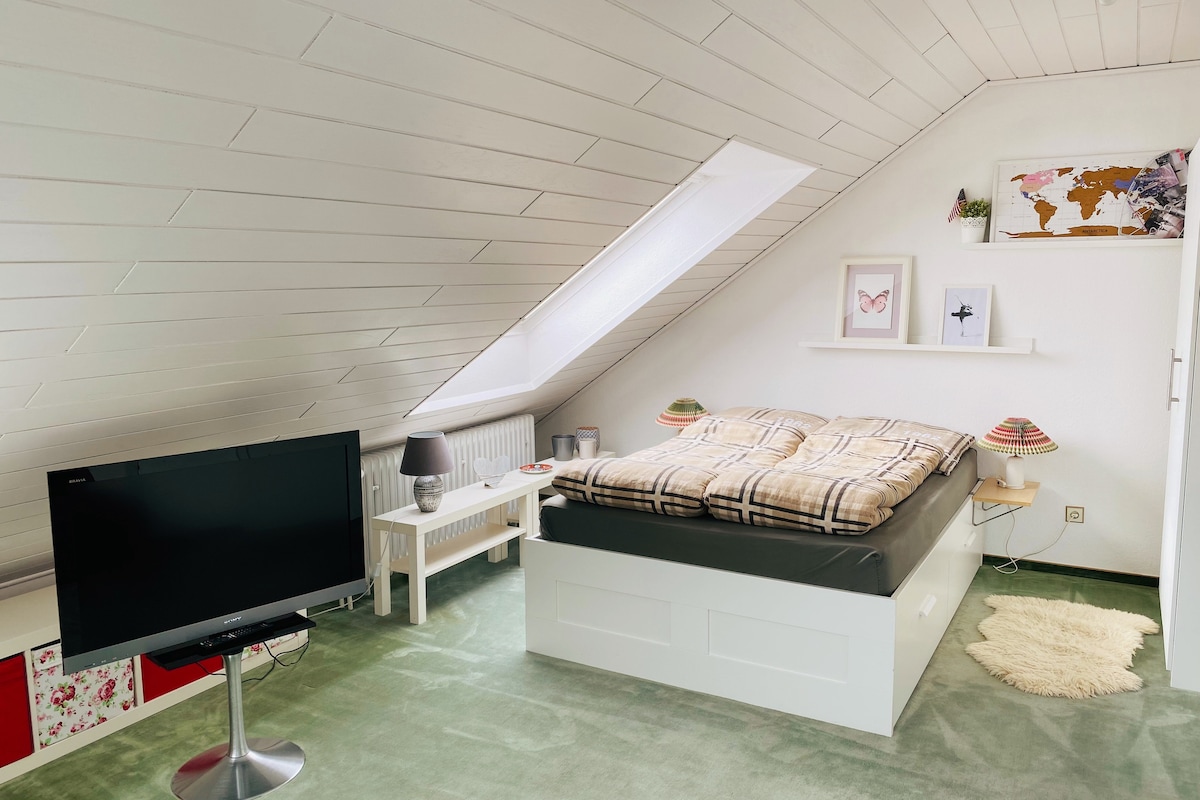 Fully furnished small apartment in an old farmhouse for one or two persons with separate entrance and view of cottage garden. situated in a quiet residential neighborhood, we're in easy reach by public transport (2 kilometers from station and university). The main room (wooden floor) is equipped with a small desk, chair, WLAN access, tv, bed (1,40x2,00m) with covers, armchair and a wardrobe . The mini kitchen comes with cooker, fridge, microwave, kettle, small table with chairs, etc. There's a level floor bathroom with shower and washing machine. Free and safe parking next to the house. You can use your own terrace, chairs and table. Please check with us first if you want to book from December.