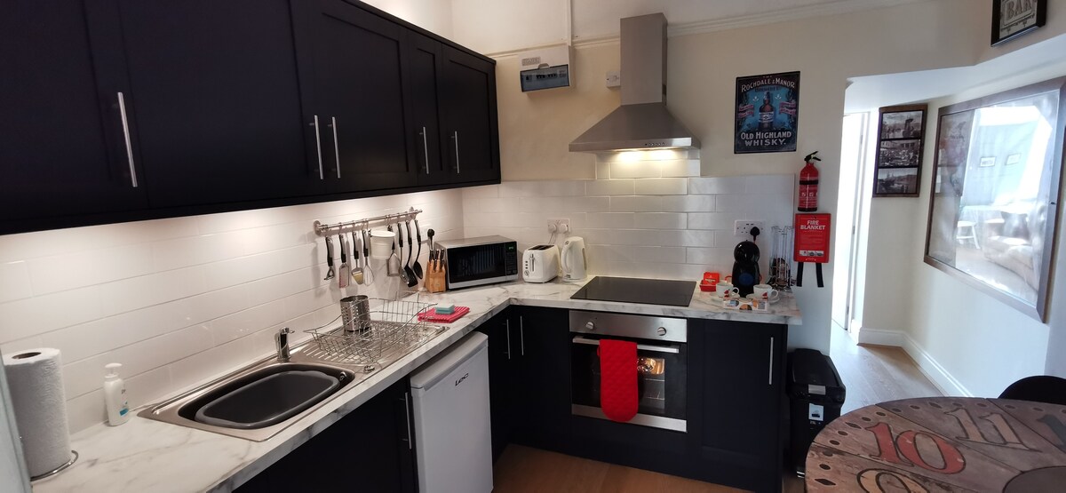 * Segundo piso * caja de llaves a las 3:00 p. m., salida a las 10:00 a. m. * Cama de matrimonio, televisor inteligente, vistas a la abadía. Secador de pelo. * Ducha eléctrica, lavabo, inodoro, toallero con calefacción. * Cocina/comedor/sala de estar de diseño abierto * Calentadores eléctricos modernos * Horno eléctrico/encimera, hervidor, tostadora, microondas, freidora de aire, nevera y congelador. * TV inteligente, Sky Basic, Amazon Prime * Wifi gratuito * Ropa de cama/toallas * té/café/azúcar/vinagre/líquido para lavar/aceite de cocina/salsas * no se admiten animales ni fumadores * Estacionamiento Westcliff @£ 11,90/24 horas gratis de noviembre a febrero