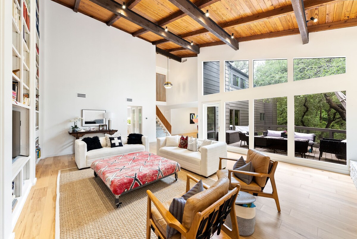 Aparece en la revista Austin Home. Finca recién remodelada de mediados de siglo de 3100 pies cuadrados en el centro de Austin. La casa cuenta con chimenea de ladrillo, techo abovedado con vigas de madera y rincones escondidos. Hay mucho espacio para dispersarse y relajarse. Pícnic en el patio trasero, juega al ping pong y foos ball, y relájate en el balcón del segundo piso con vistas al país de la colina. A poca distancia de Hill Country y viñedos, a 7 minutos en coche del centro de la ciudad. NO SE PERMITEN FIESTAS GRANDES, altavoces ni fumar.