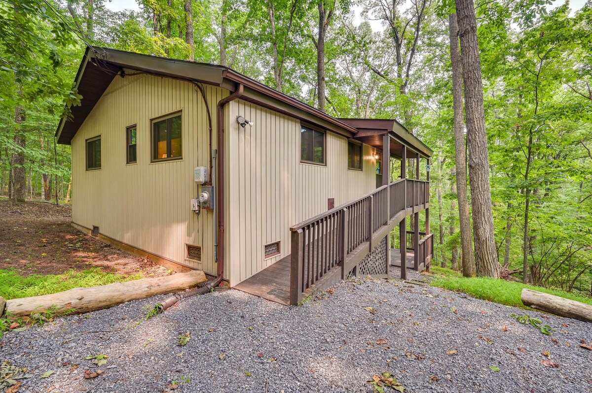 With its cozy ambiance and laid-back charm, this Hedgesville vacation rental offers the ideal escape to West Virginia! Nestled in The Woods community, ‘Whispering Woods’ gives you privacy while also being near countless attractions. Swim in the community pools, play around in the sports center, or relax in the mineral spa at Berkeley Springs State Park. Then, enjoy an afternoon drink on the double deck before cozying up by the fireplace of this 2-bedroom, 1-bath cabin with your loved ones!